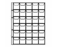 Лист изготовлен из пленки повышенной прозрачности. 30 ячеек с клапаном для монет диаметром до 30 мм. Наружный формат 192x214 мм. Подходит к папкам-переплётам Numis.