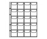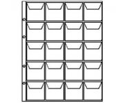 Лист изготовлен из пленки повышенной прозрачности. 20 ячеек с клапаном для монет диаметром до 37 мм. Наружный формат 192x214 мм. Подходит к папкам-переплётам Numis.
