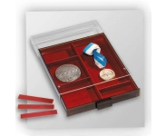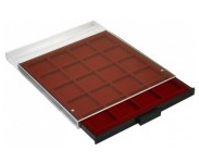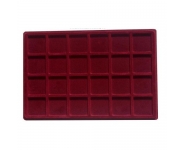 Планшет для 24 монет с квадратными ячейками 47x47 мм. Цвет красный, наружный формат 334x220 мм. Подходит к кейсам KO3, KO6 и папке MK 4 TAB LEER.