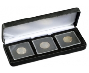 Коробка для 1 монеты из черного пластика, с защёлкой. Размещение монеты путём её вдавливания в принимающий форму монеты ложемент. Диаметр монеты до 30 мм. Наружный формат 45x45 мм.
