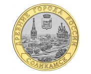 Реверс: архитектурная панорама города, вверху - герб города Соликамска, по окружности на кольце - надписи, вверху: "ДРЕВНИЕ ГОРОДА РОССИИ", внизу: "СОЛИКАМСК".