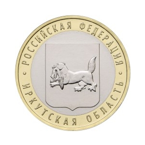Реверс: в центре диска изображение герба Иркутской области, по окружности – надписи, разделенные двумя точками: вверху – "РОССИЙСКАЯ ФЕДЕРАЦИЯ", внизу – "ИРКУТСКАЯ ОБЛАСТЬ".
